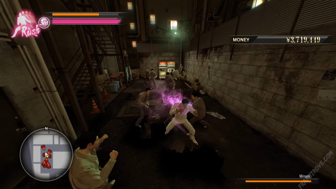 With his position precarious, Kiryu soon faces the chapter’s main battle: his third boss encounter with Daisaku Kuze. Kuze, fighting with brass knuckles and wild aggression, demonstrates the Dojima Family’s persistence. Kiryu manages to win, yet the overwhelming number of enemies nearly defeats him—until Tetsu Tachibana and Oda arrive to help him escape.